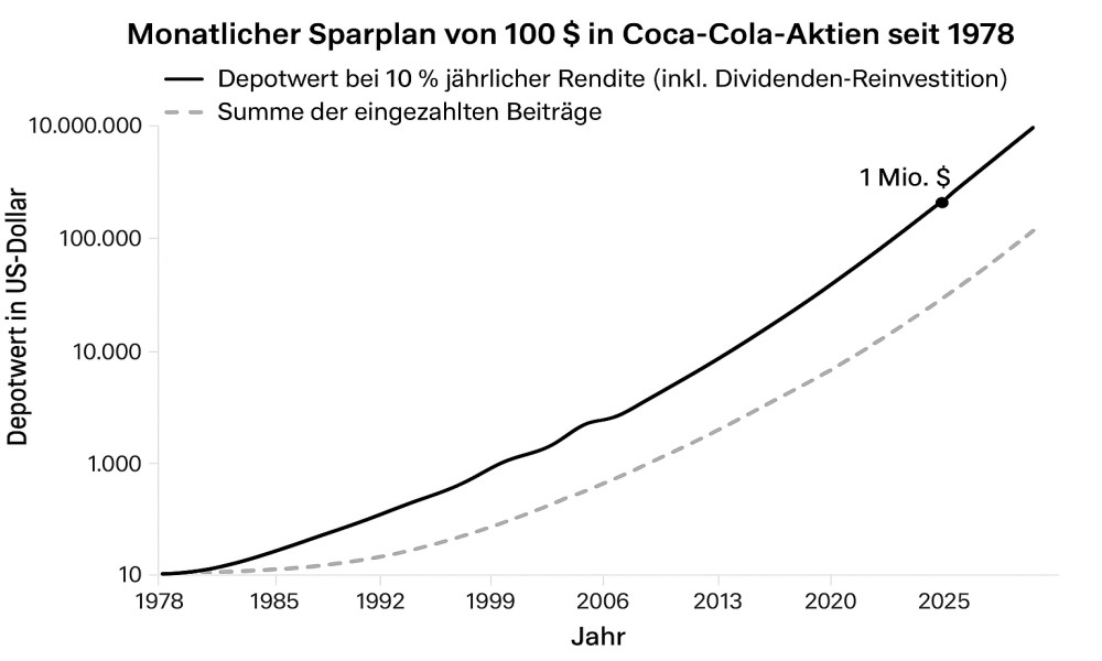 Zu welchem Zeitpunkt hätte ich beginnen müssen, monatlich 100 US-Dollar in die Coca-Cola-Aktie zu investieren, um bis heute ein Vermögen von 1 Million US-Dollar aufgebaut zu haben?