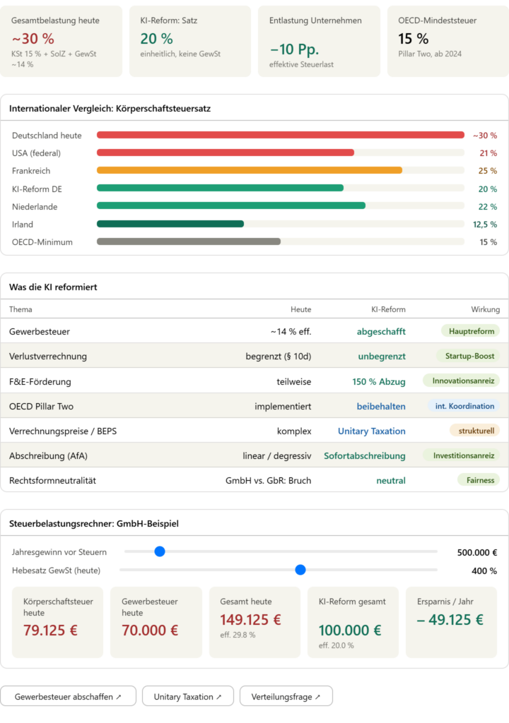 Die Unternehmensbesteuerung ist das komplexeste Kapitel der Steuerreform — weil hier nationale Gestaltung auf internationale Realität trifft. Das KI-Modell muss beides gleichzeitig lösen.