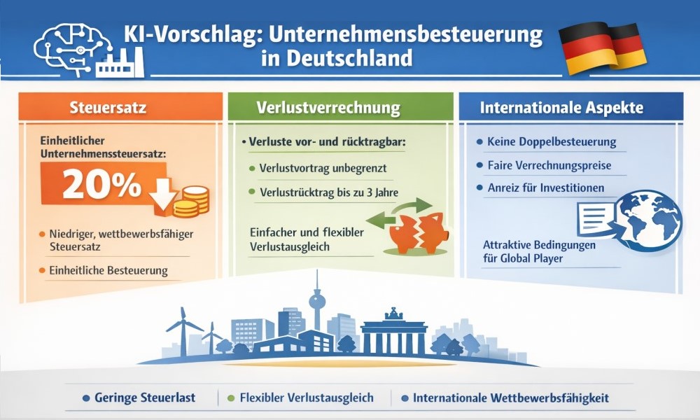 Wie sollte eine KI die Unternehmensbesteuerung in Deutschland gestalten – Steuersatz, Verlustverrechnung, internationale Aspekte?